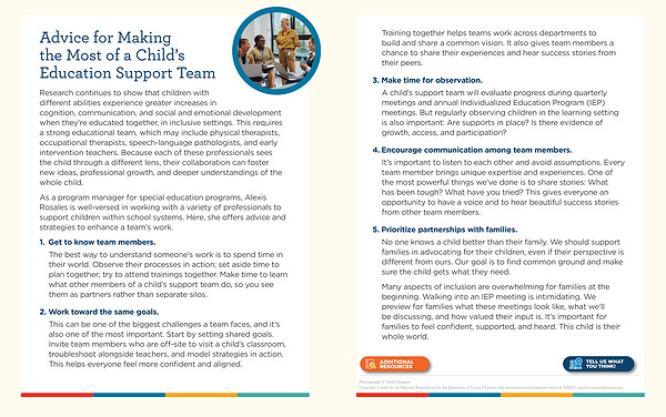 Many aspects of inclusion are overwhelming for families at the beginning. Walking into an IEP meeting is intimidating. We preview for families what these meetings look like, what we’ ll be discussing, and how valued their input is. It’ s important for families to feel confident, supported, and heard. This child is their whole world.