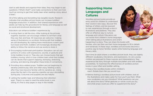 › Choosing books that lend themselves to rich, repeated readings, and connecting them to ideas or themes that can be explored multiple times. Illustrations should be appealing, detailed, and relevant to the text. Compelling characters will help children deepen their reading comprehension. › Asking open-ended questions that move beyond simple recall. Questions should prompt children to use new vocabulary, analyze characters’ feelings, and begin to understand how words and pictures work together to tell a story.