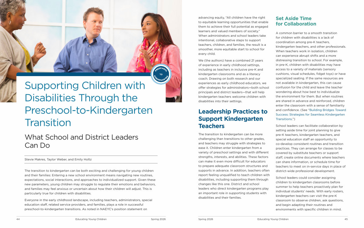 Everyone in the early childhood landscape, including teachers, administrators, special education staff, related service providers, and families, plays a role in successful preschool-to-kindergarten transitions. As noted in NAEYC’s position statement on advancing equity, “All children have the right to equitable learning opportunities that enable them to achieve their full potential as engaged learners and valued members of society.” When administrators and school leaders take intentional, collaborative steps to support teachers, children, and families, the result is a smoother, more equitable start to school for every child.