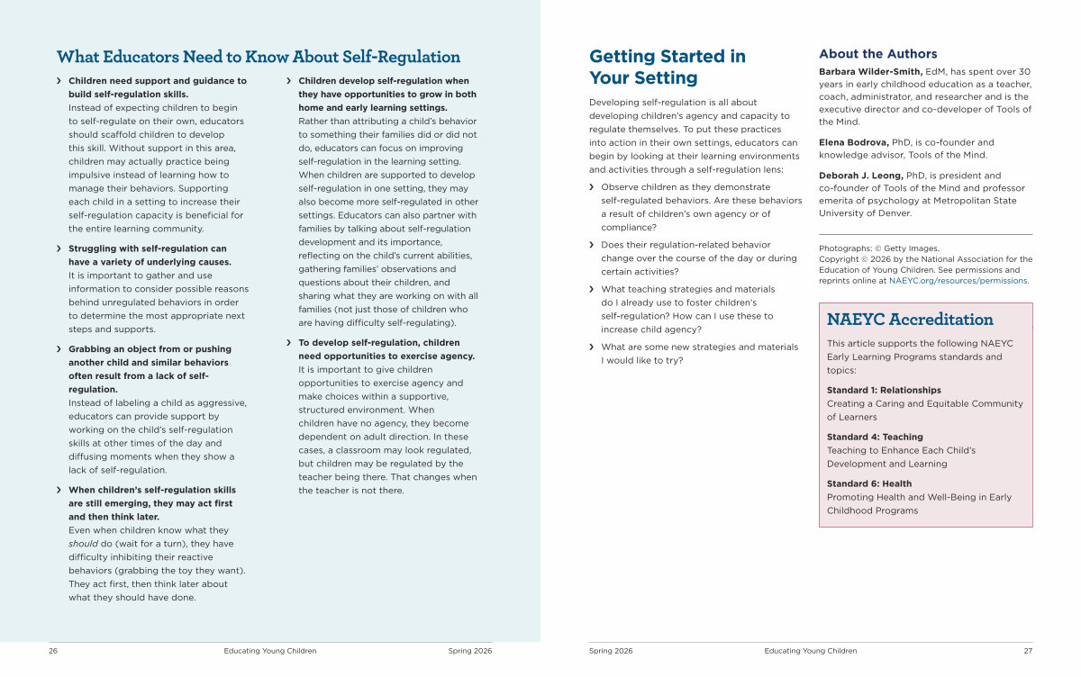 › Children need support and guidance to build self-regulation skills. Instead of expecting children to begin to self-regulate on their own, educators should scaffold children to develop this skill. Without support in this area, children may actually practice being impulsive instead of learning how to manage their behaviors. Supporting each child in a setting to increase their self-regulation capacity is beneficial for the entire learning community.
