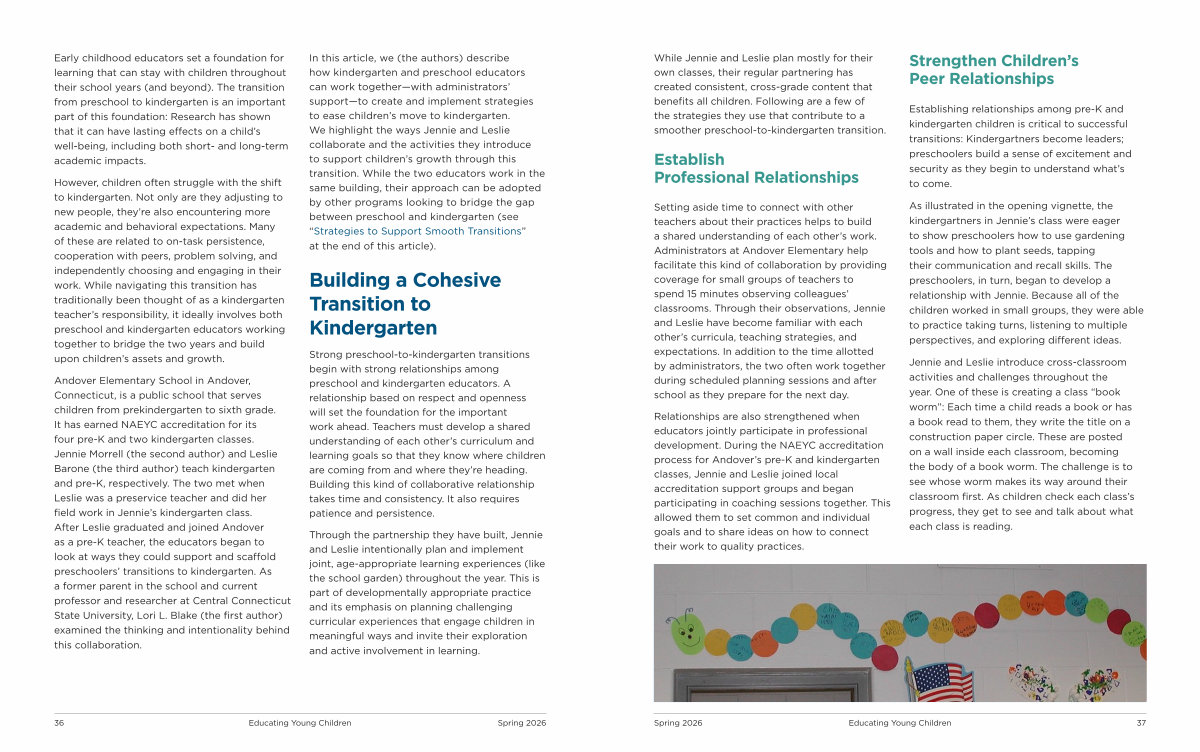 In this article, we( the authors) describe how kindergarten and preschool educators can work together— with administrators’ support— to create and implement strategies to ease children’ s move to kindergarten. We highlight the ways Jennie and Leslie collaborate and the activities they introduce to support children’ s growth through this transition. While the two educators work in the same building, their approach can be adopted by other programs looking to bridge the gap between preschool and kindergarten( see“ Strategies to Support Smooth Transitions” at the end of this article).
