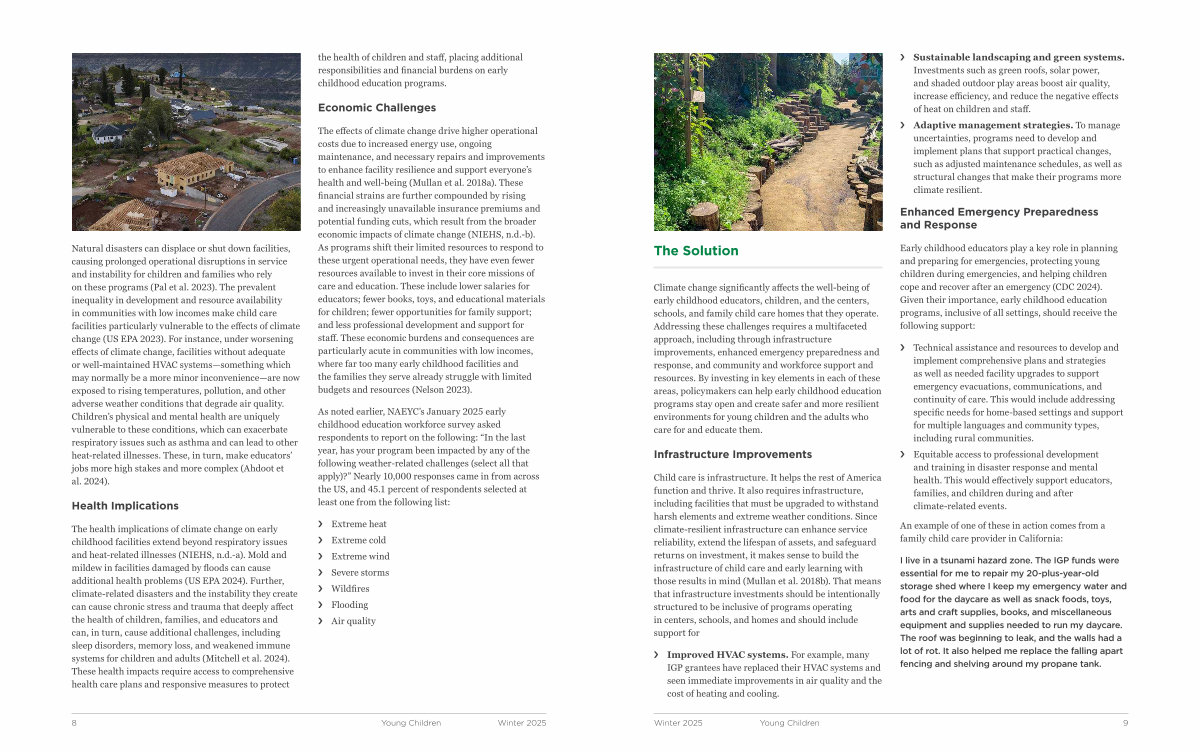 Natural disasters can displace or shut down facilities, causing prolonged operational disruptions in service and instability for children and families who rely on these programs( Pal et al. 2023). The prevalent inequality in development and resource availability in communities with low incomes make child care facilities particularly vulnerable to the effects of climate change( US EPA 2023). For instance, under worsening effects of climate change, facilities without adequate or well-maintained HVAC systems— something which may normally be a more minor inconvenience— are now exposed to rising temperatures, pollution, and other adverse weather conditions that degrade air quality. Children’ s physical and mental health are uniquely vulnerable to these conditions, which can exacerbate respiratory issues such as asthma and can lead to other heat-related illnesses. These, in turn, make educators’ jobs more high stakes and more complex( Ahdoot et al. 2024).